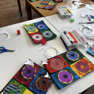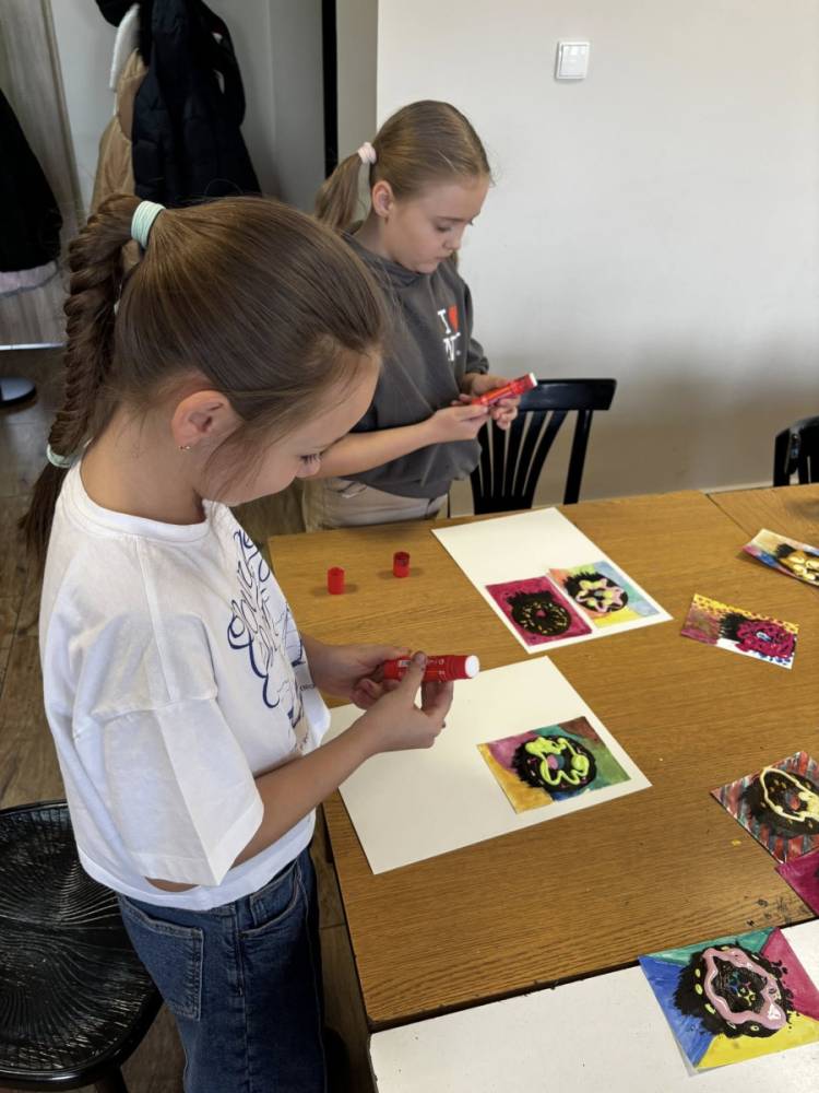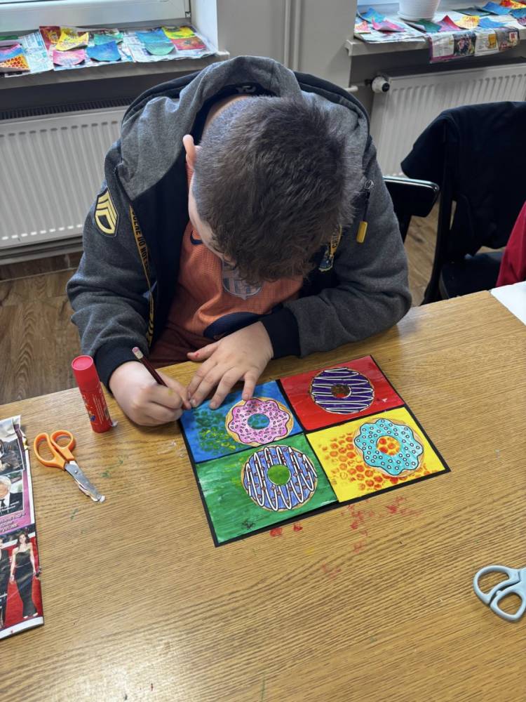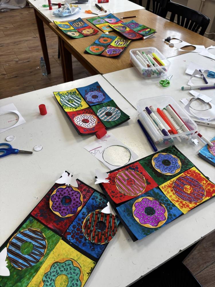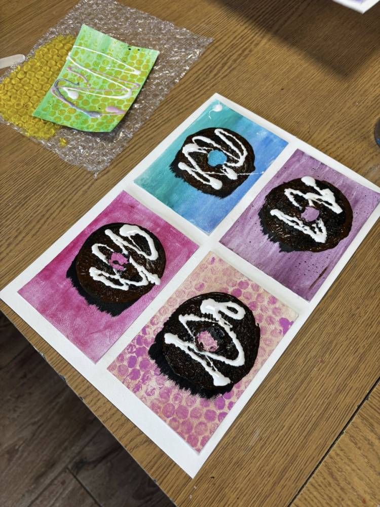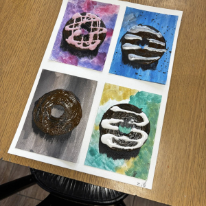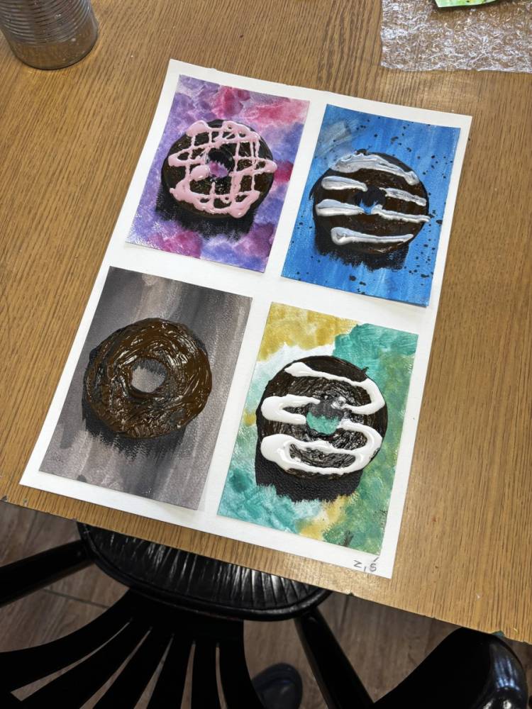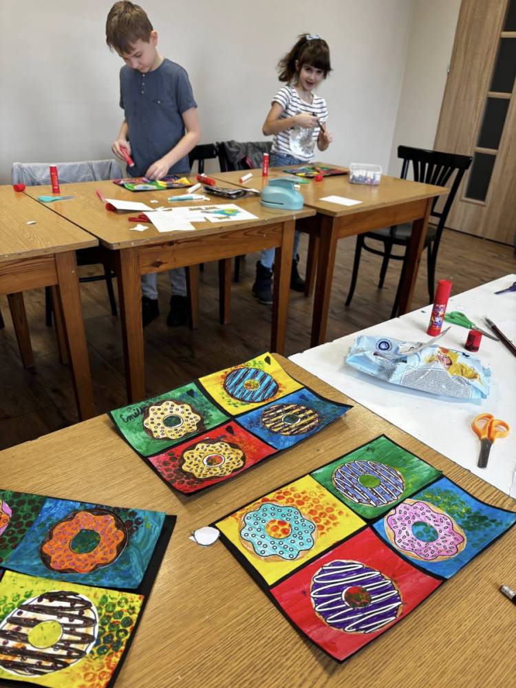 Uczestnicy obu grup stworzyli prace składające się z czterech pól – cztery różne kolory tła i cztery wyjątkowe donuty. Każdy „smakołyk” miał swój charakter i niepowtarzalne zestawienie barw – było intensywnie, odważnie i bardzo apetycznie!