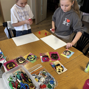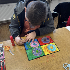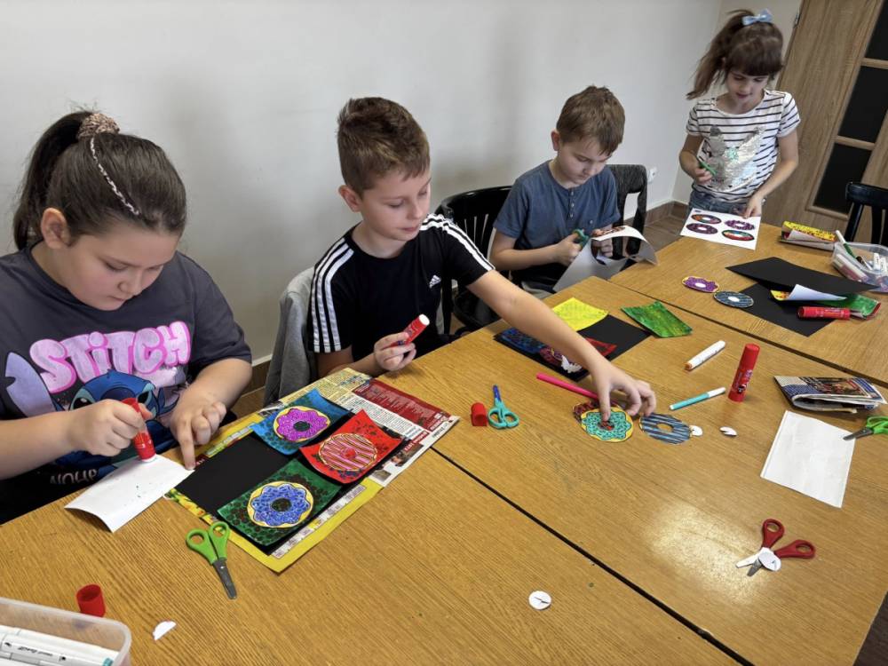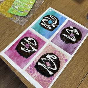 Młodsza grupa eksperymentowała z folią bąbelkową co dało ciekawe efekty tła, a donuty były kolorowane i podbijane flamastrami, co dodało im wyrazistości.