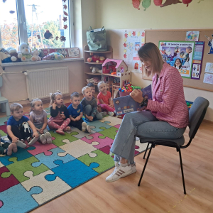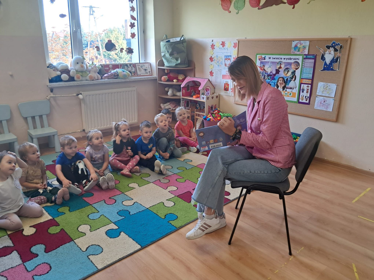 Po raz kolejny odwiedziliśmy przedszkolaki z Zespołu Szkolno-Przedszkolnego w Trębaczewie. 22 października 2025 r., grupa 3-latków z zainteresowaniem wysłuchała opowiadania „Jadzia Pętelka idzie na spacer”, poznając przygody sympatycznej dziewczynki odkrywającej uroki jesieni. Po lekturze dzieci wykonały piękne, przestrzenne drzewa z papieru i liści. Zajęcia przyniosły maluchom wiele radości i były doskonałą okazją do rozwijania wyobraźni.