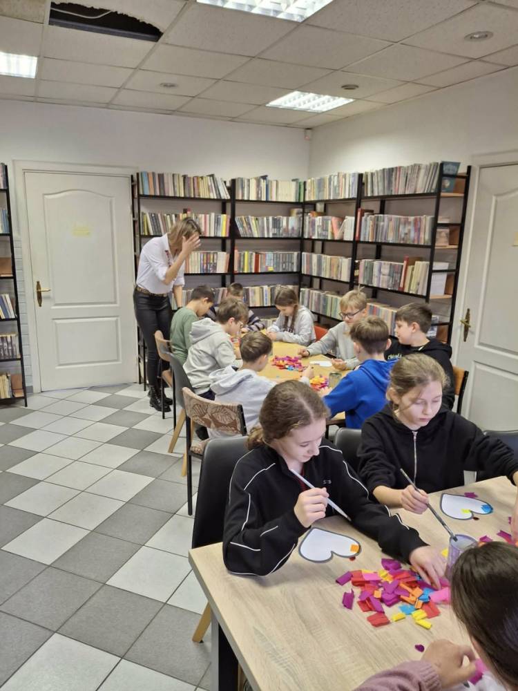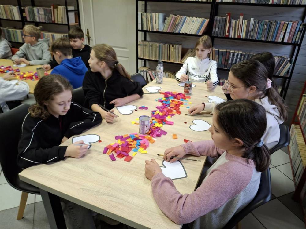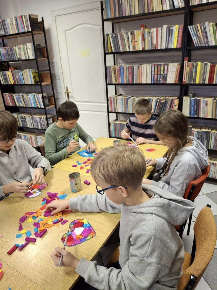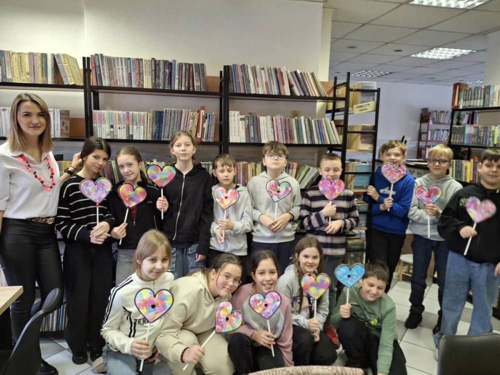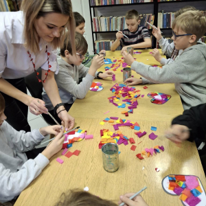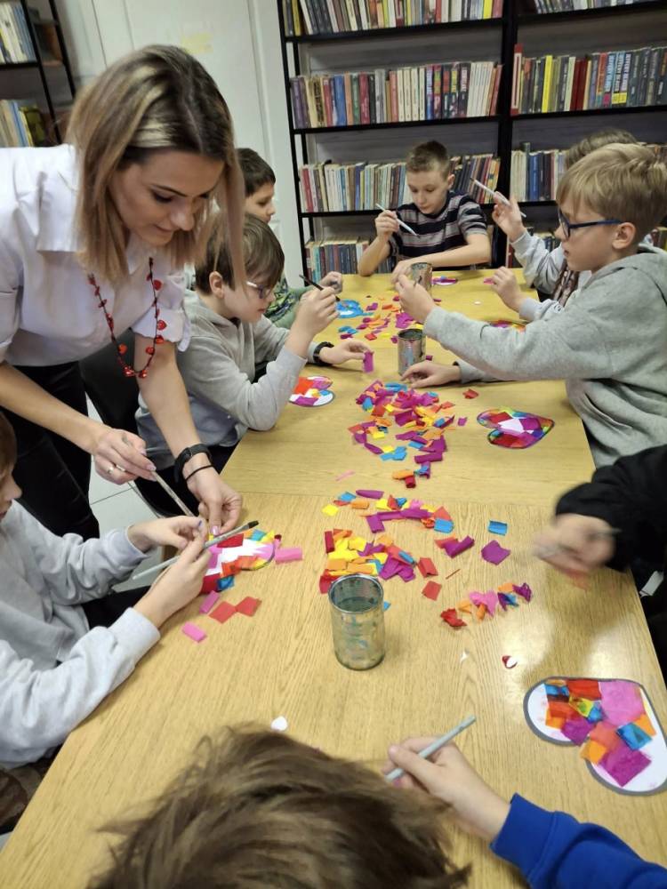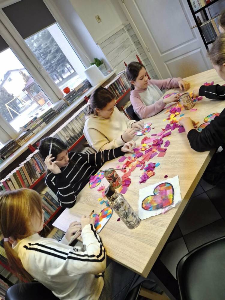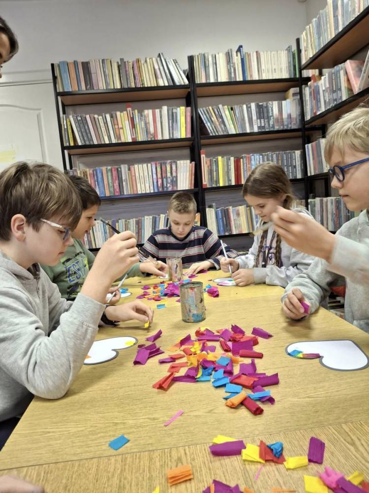 Po części czytelniczej dzieci wykonały pracę plastyczną – serca na patyku, ozdobione kolorową bibułą. W swoje prace włożyły dużo cierpliwości i wytrwałości, a efekty były naprawdę piękne.