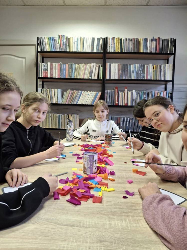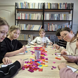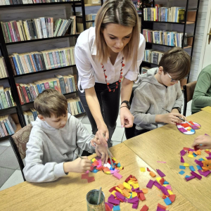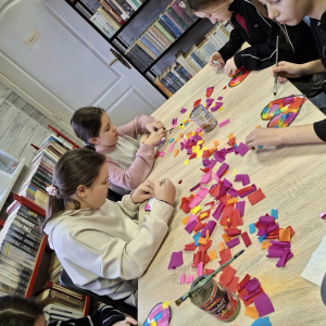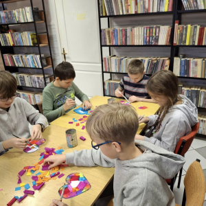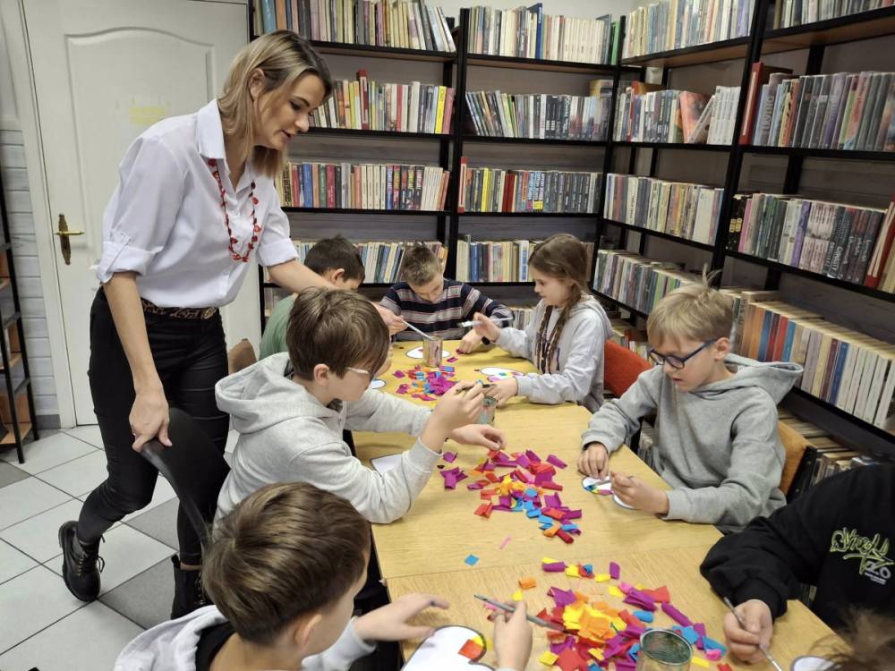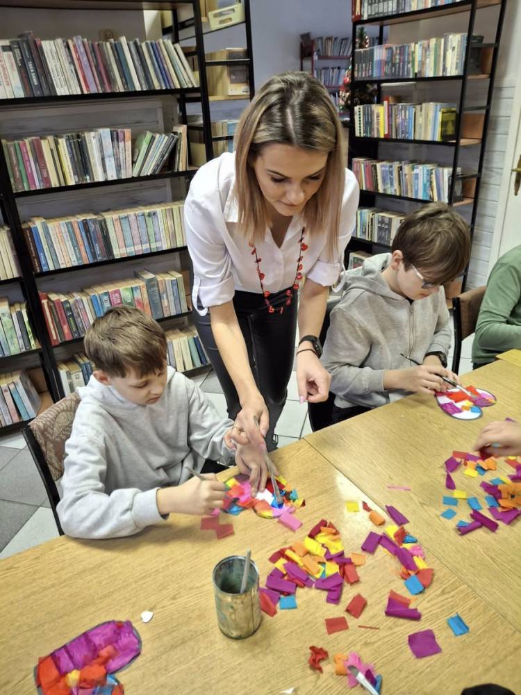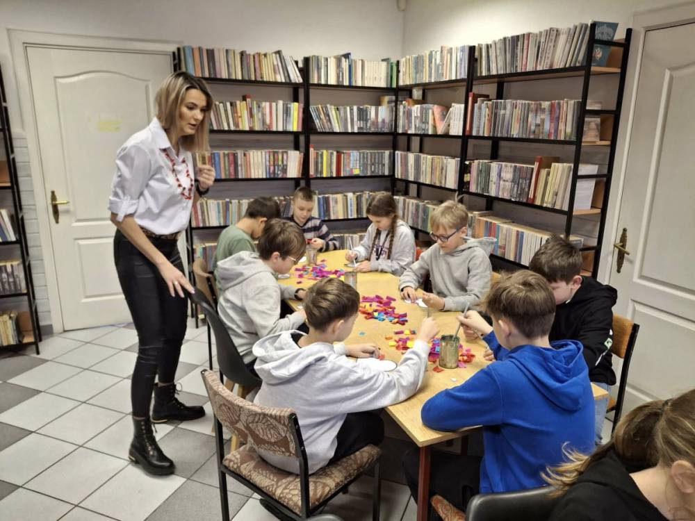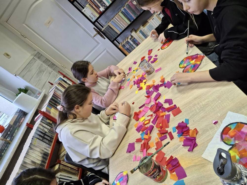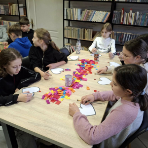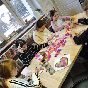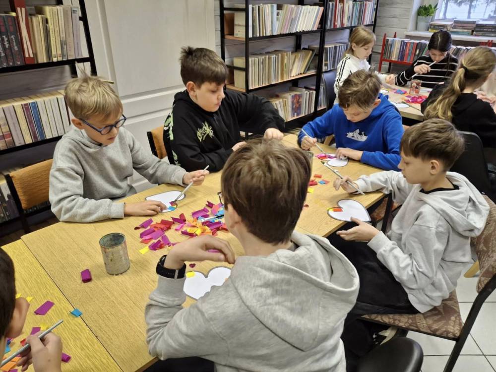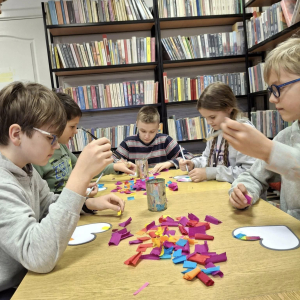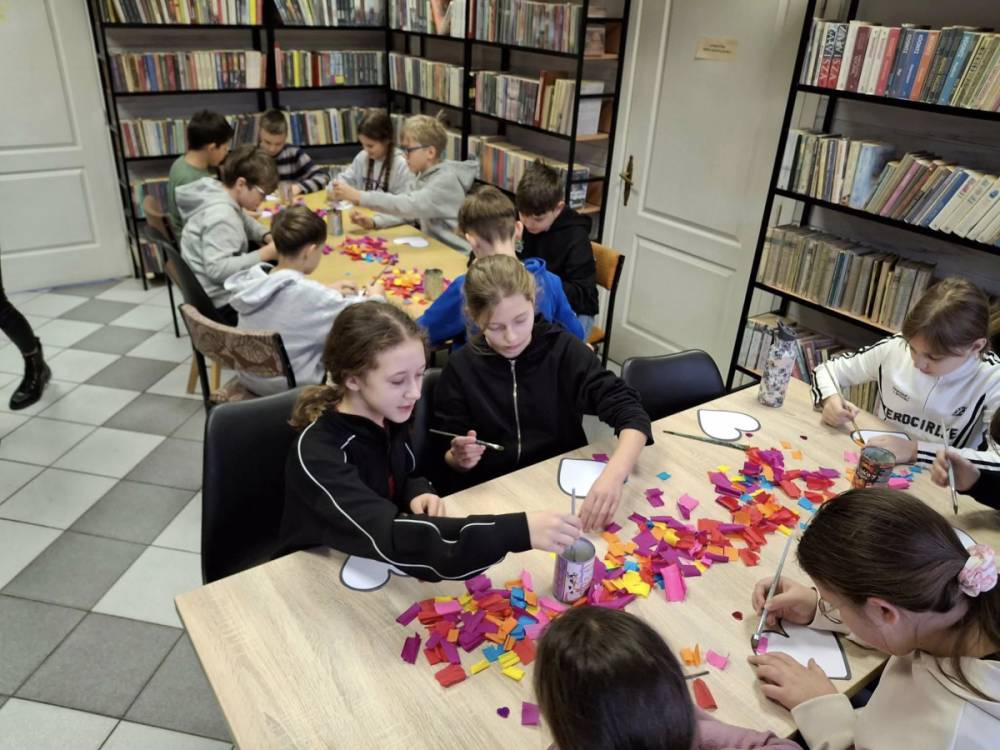 Po części czytelniczej dzieci wykonały pracę plastyczną – serca na patyku, ozdobione kolorową bibułą. W swoje prace włożyły dużo cierpliwości i wytrwałości, a efekty były naprawdę piękne.