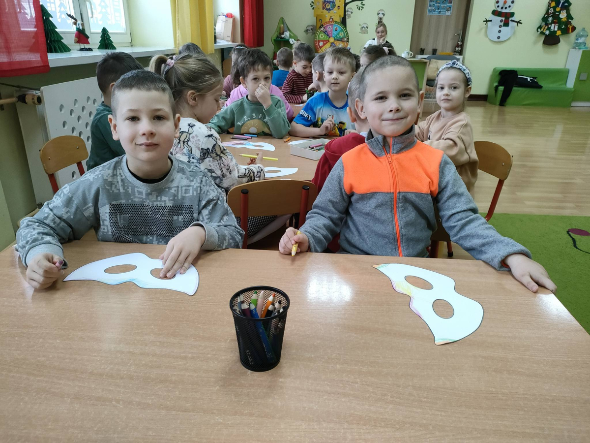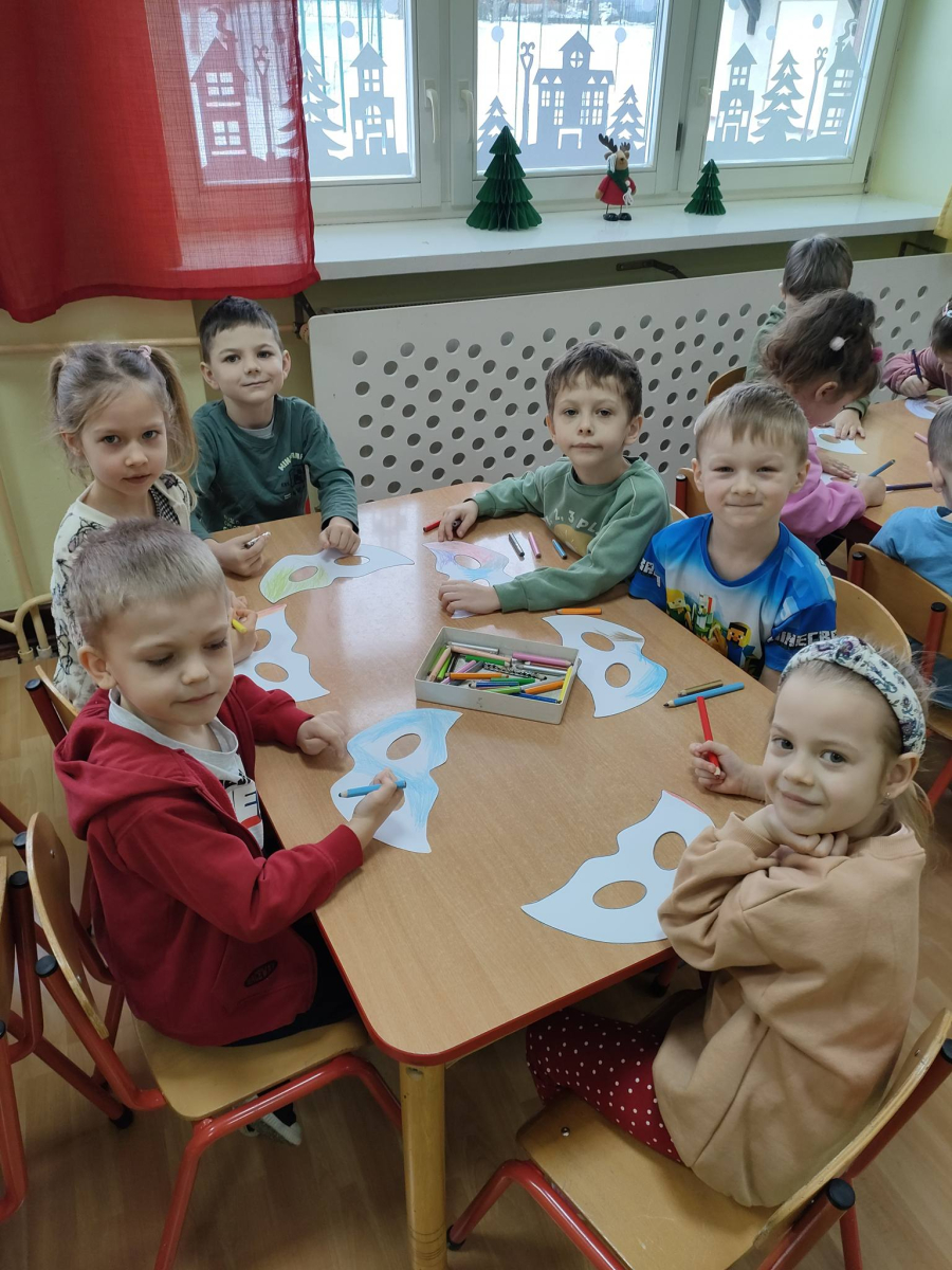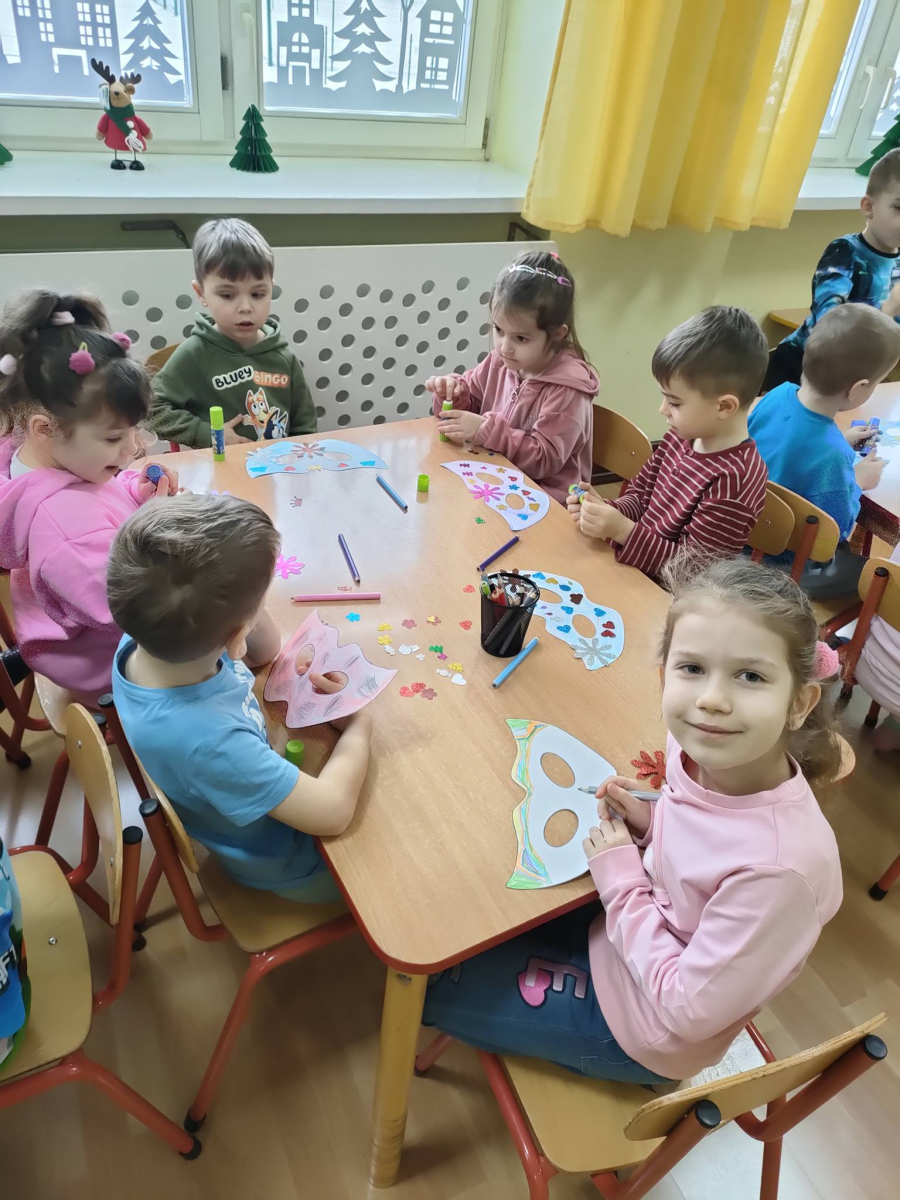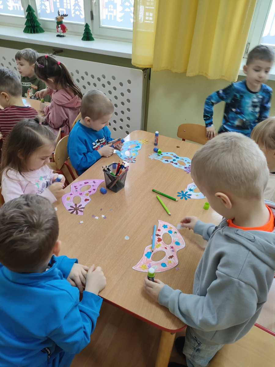 Na zakończenie spotkania dzieci z wielkim zaangażowaniem wykonały piękne, kolorowe maski karnawałowe. Prace były kolorowane i wzbogacane brokatowymi, przyklejanymi wzorami, dzięki czemu każda maska stała się niepowtarzalna. Kreatywności, radości i uśmiechów nie brakowało.