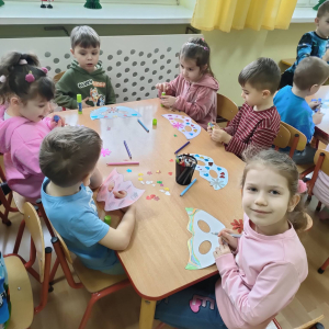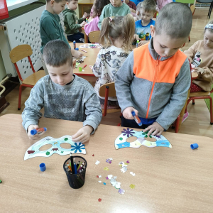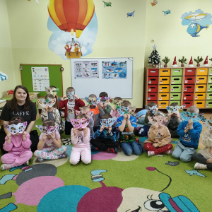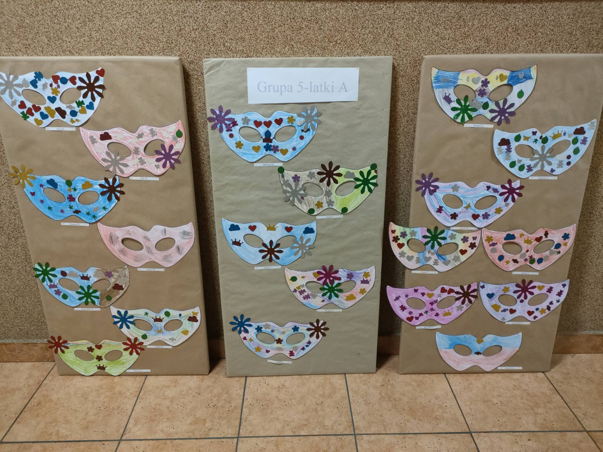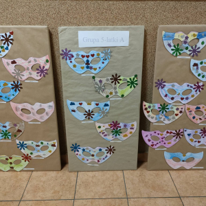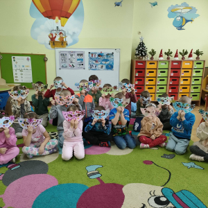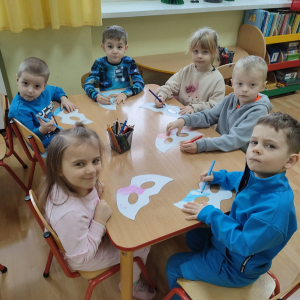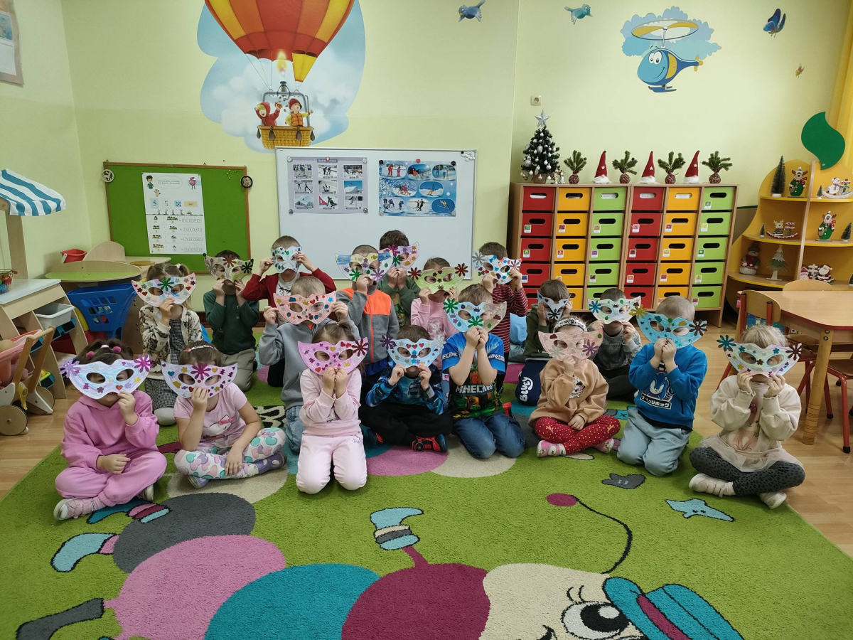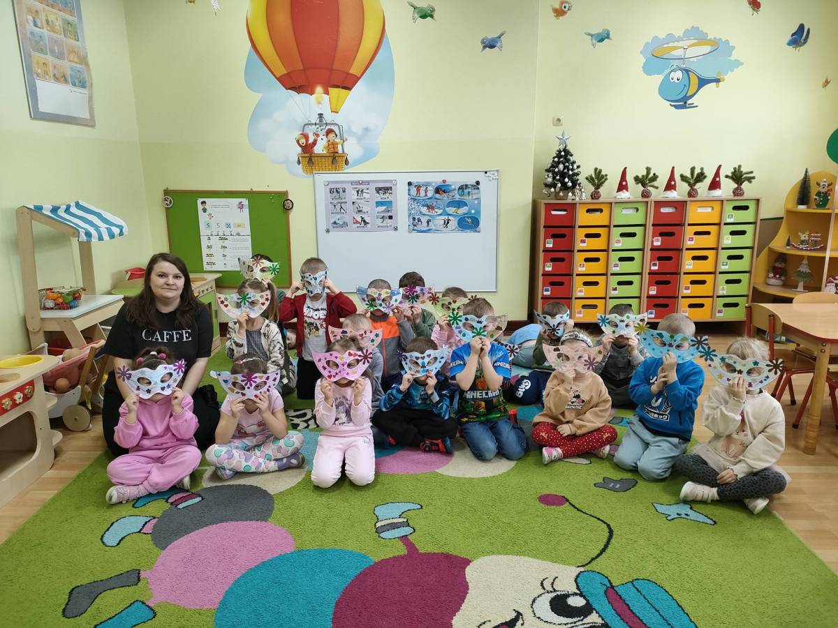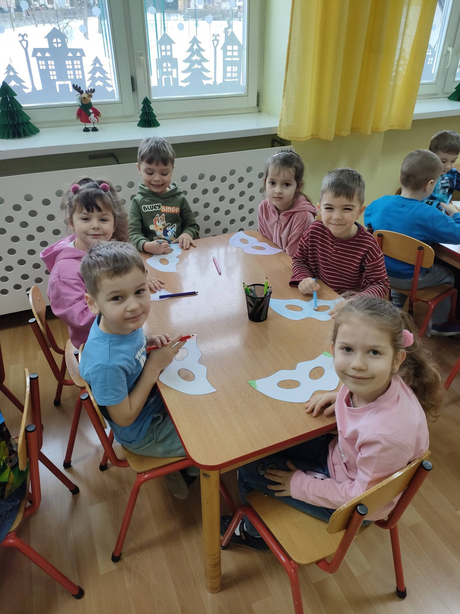 Na zakończenie spotkania dzieci z wielkim zaangażowaniem wykonały piękne, kolorowe maski karnawałowe. Prace były kolorowane i wzbogacane brokatowymi, przyklejanymi wzorami, dzięki czemu każda maska stała się niepowtarzalna. Kreatywności, radości i uśmiechów nie brakowało.