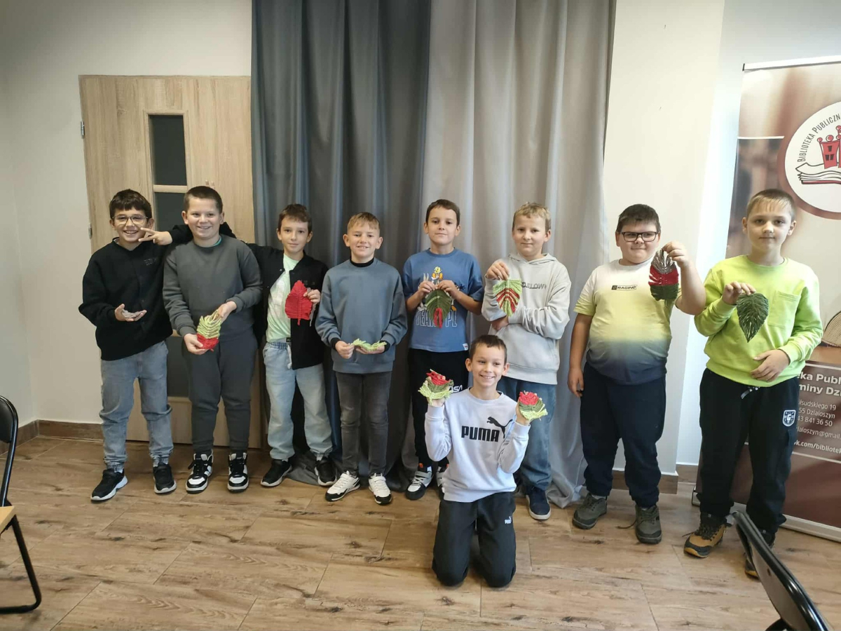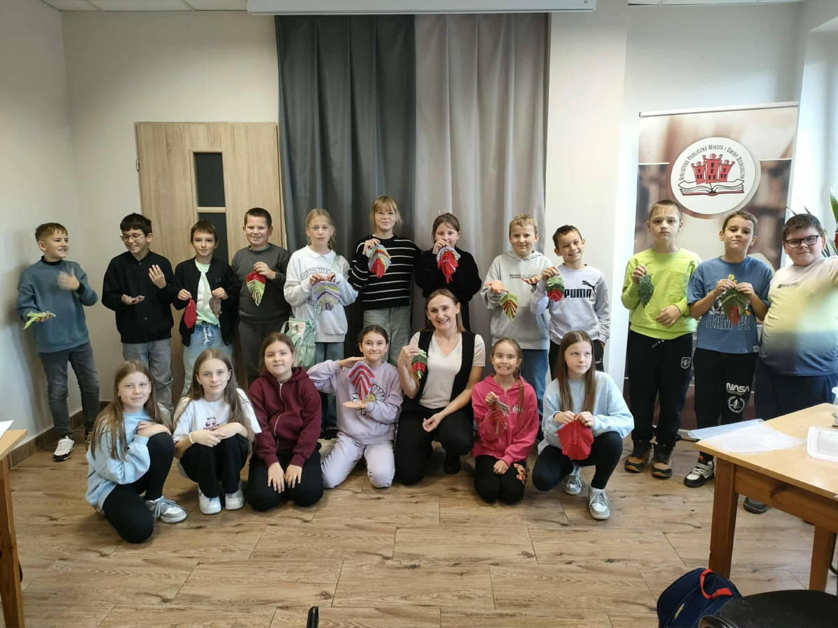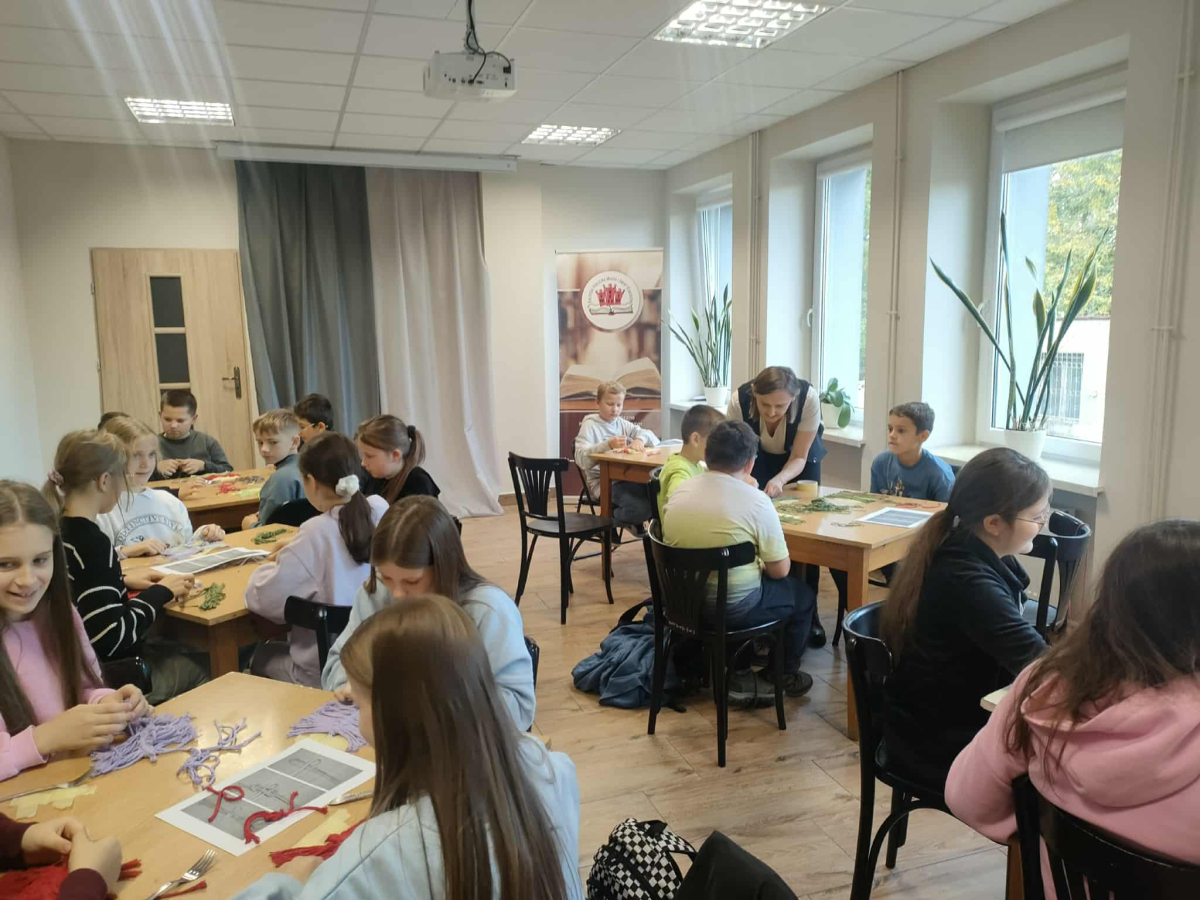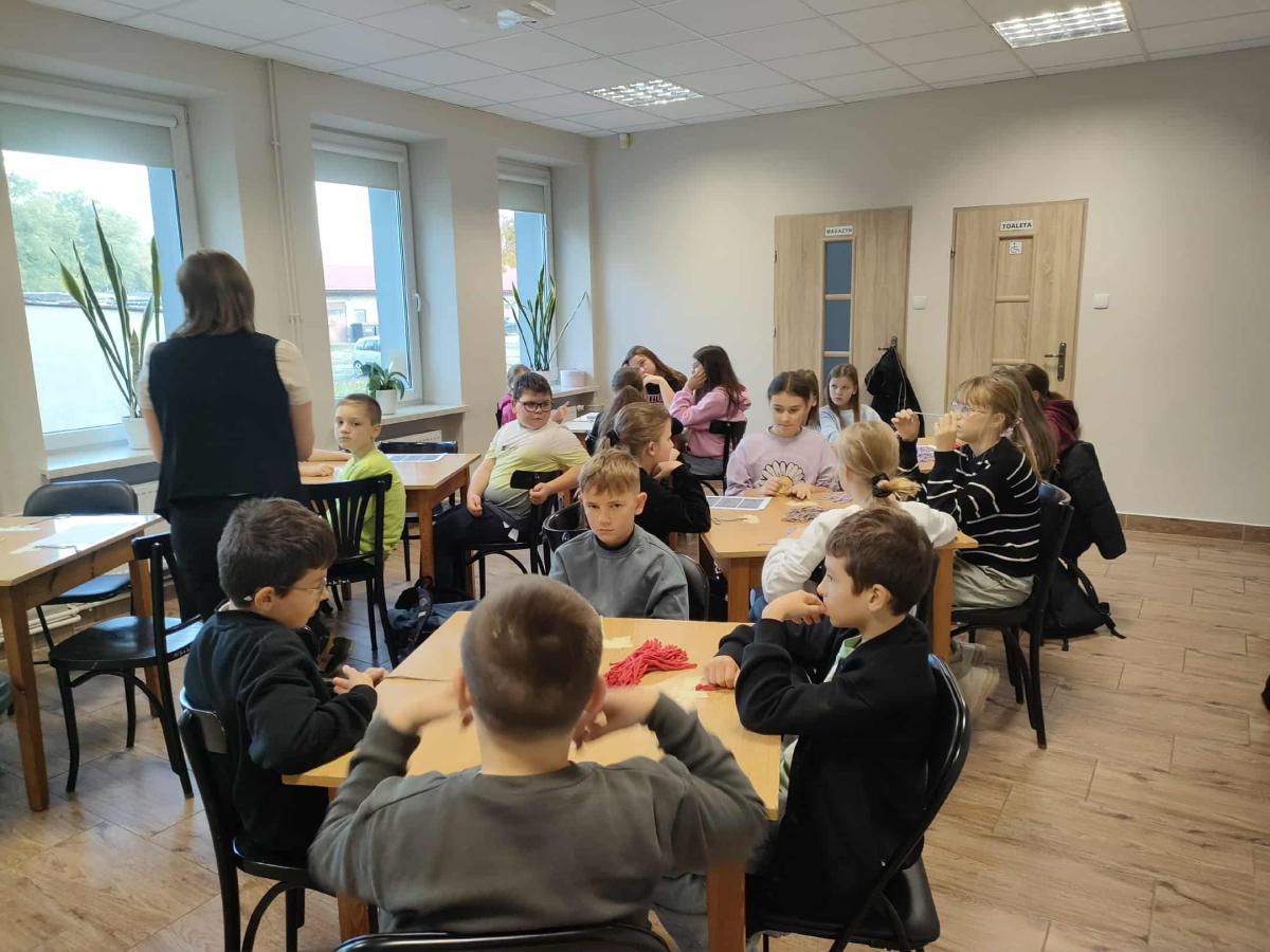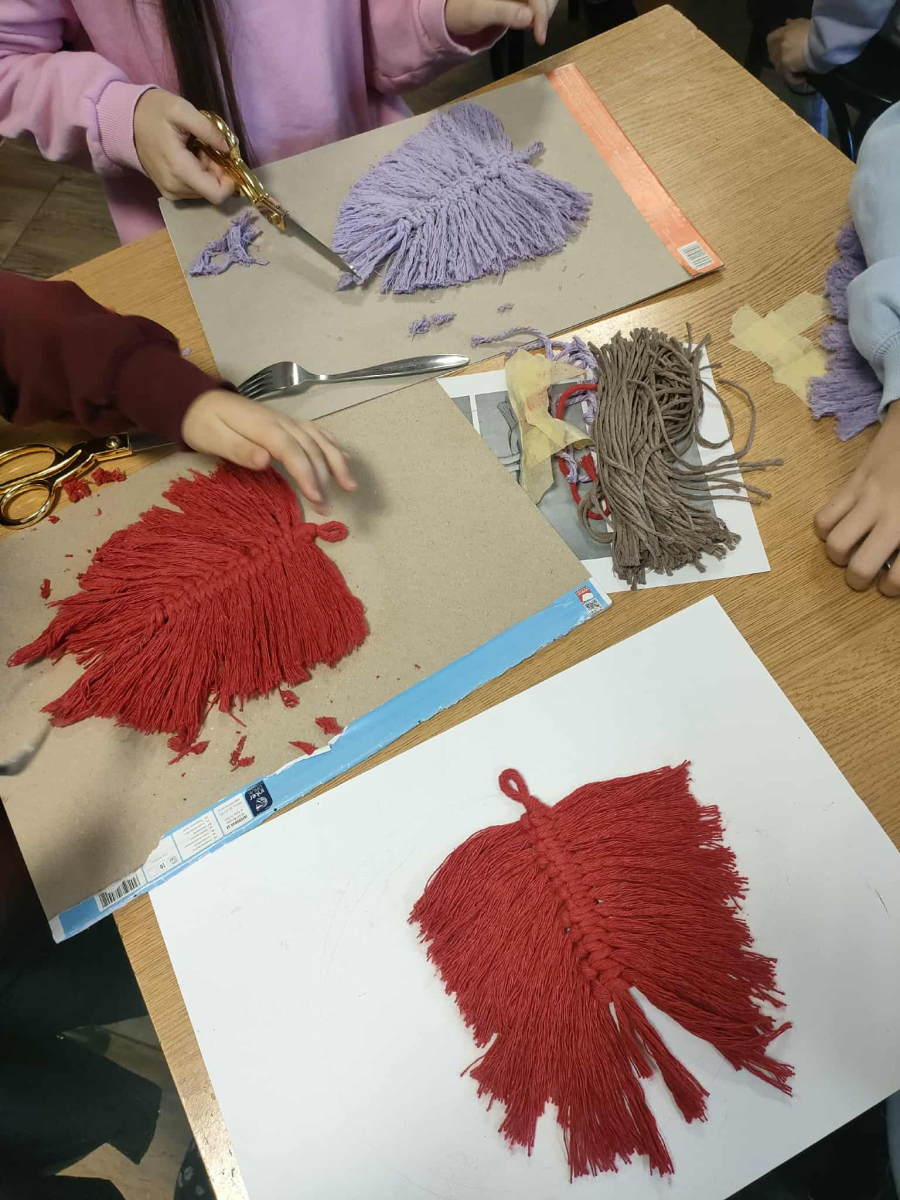 21 października 2025 r naszą bibliotekę odwiedzili uczniowie klasy IV z Zespołu Szkolno-Przedszkolnego w Raciszynie z Fililną Szkołą w Kolonii Lisowice. Tego dnia przeprowadzone zostały wyjątkowe warsztaty artystyczne, podczas których uczniowie wykonywali jesienne liście techniką makramy. Spotkanie upłynęło w ciepłej, twórczej atmosferze – pełnej rozmów, uśmiechów i odrobiny sznurkowej magii!