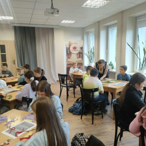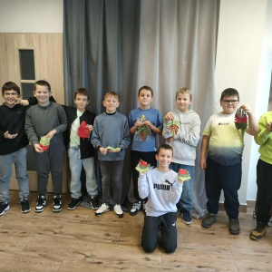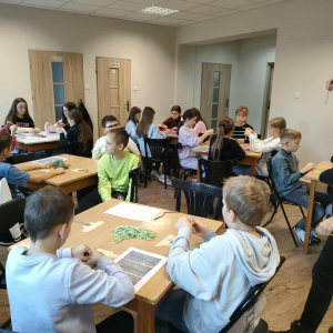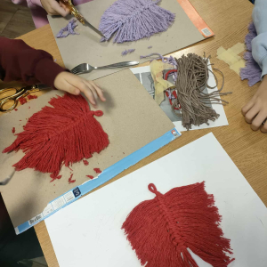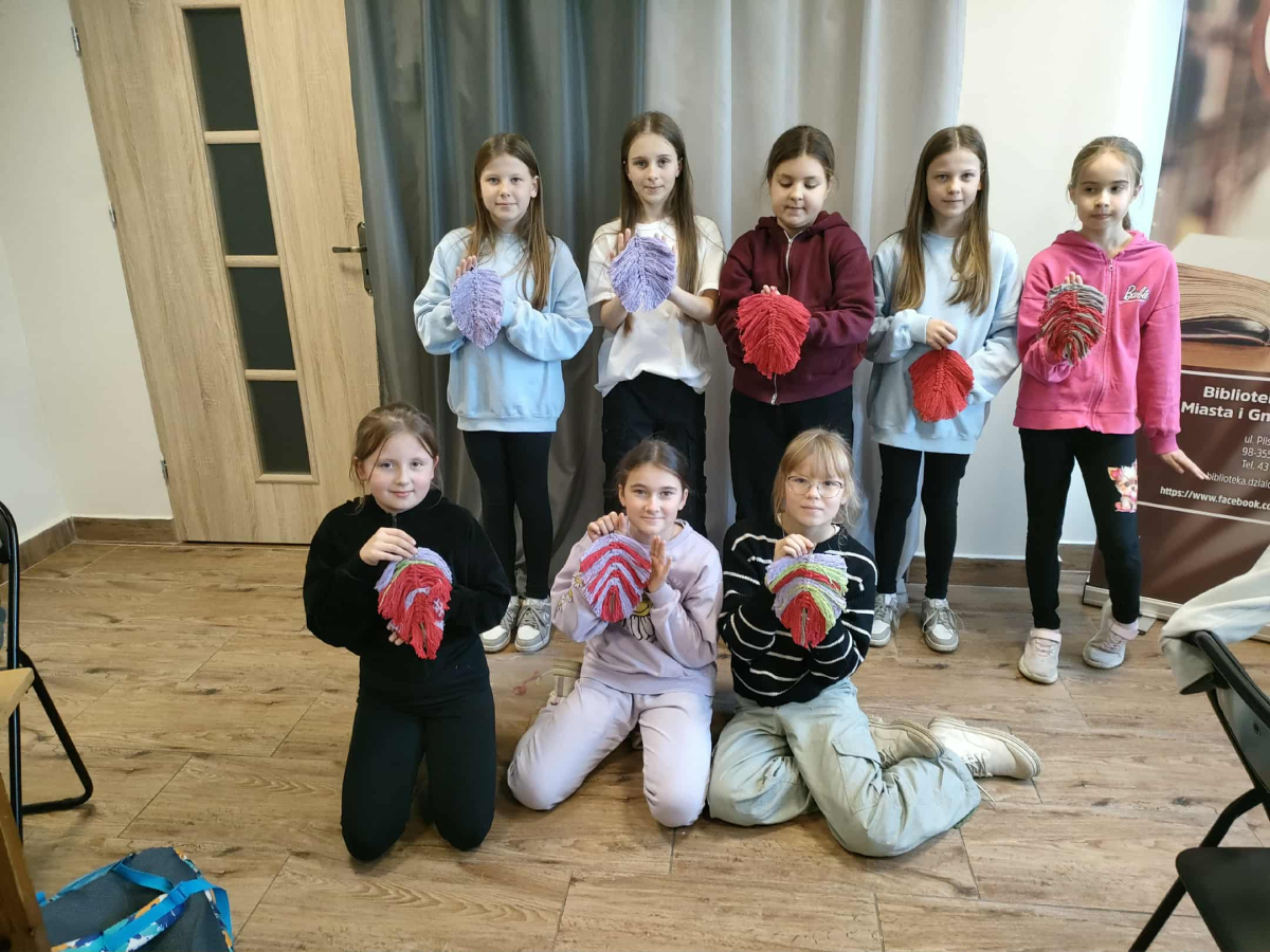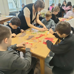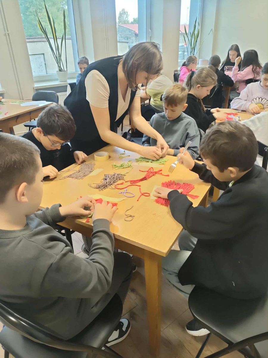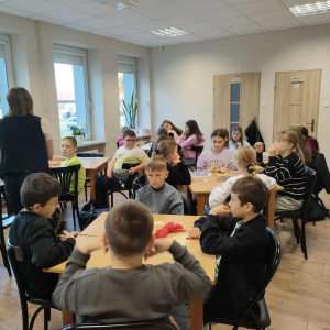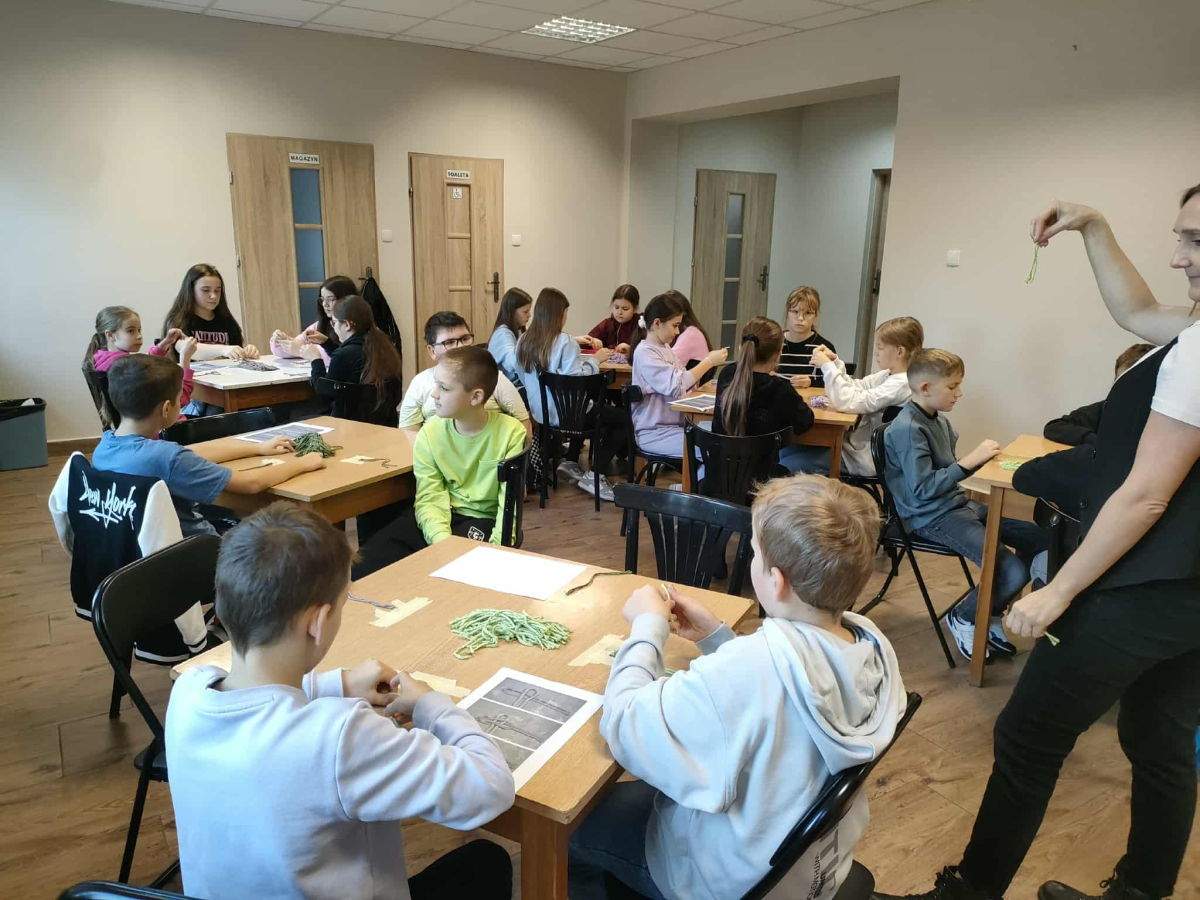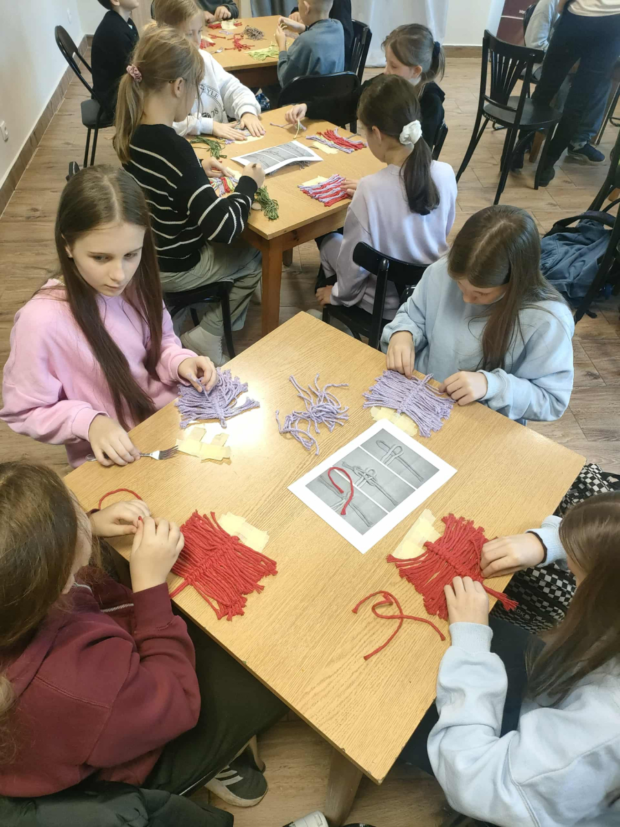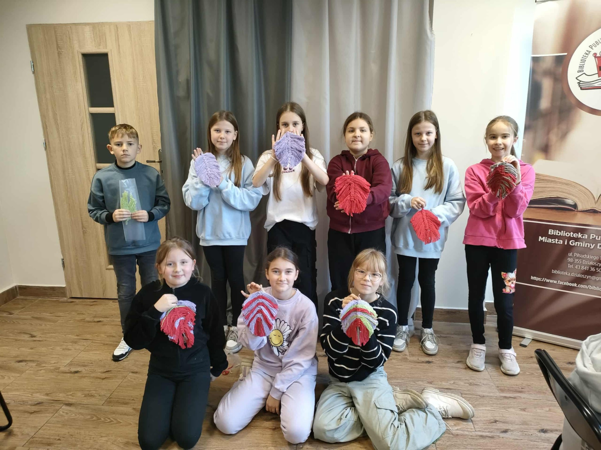 21 października 2025 r naszą bibliotekę odwiedzili uczniowie klasy IV z Zespołu Szkolno-Przedszkolnego w Raciszynie z Fililną Szkołą w Kolonii Lisowice. Tego dnia przeprowadzone zostały wyjątkowe warsztaty artystyczne, podczas których uczniowie wykonywali jesienne liście techniką makramy. Spotkanie upłynęło w ciepłej, twórczej atmosferze – pełnej rozmów, uśmiechów i odrobiny sznurkowej magii!