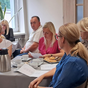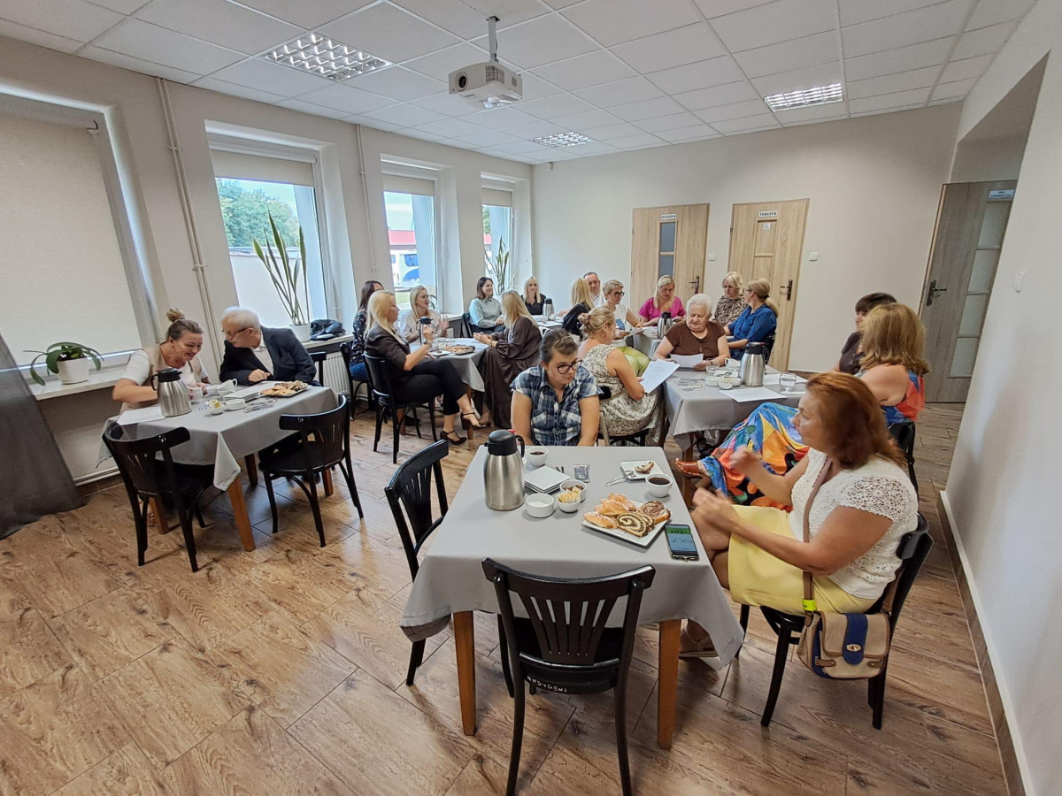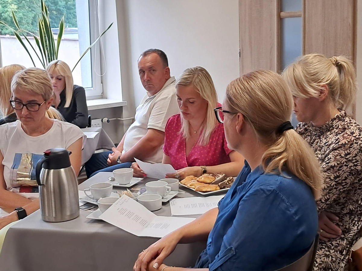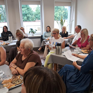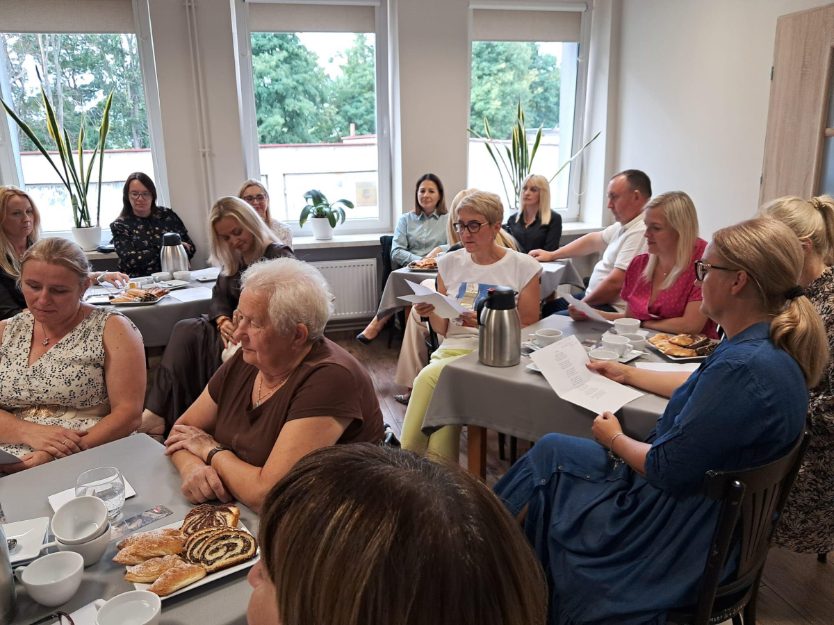 Spotkanie rozpoczęliśmy nietypowo – od krótkiego filmu, w którym sam Kochanowski, ożywiony dzięki sztucznej inteligencji, opowiedział o sobie i swojej poezji. Następnie wspólnie wsłuchiwaliśmy się w jego utwory. Jako pierwsza wybrzmiała „Pieśń świętojańska o Sobótce”: wstęp przeczytał Pan Marian Konieczny (emerytowany nauczyciel) a w rolę 12 panien wcieliły się: dyrektor Szkoła Podstawowa im. św. Jana Pawła II w Działoszynie Pani Anna Szczerkowska wraz z nauczycielkami - Panią Alicją Drab, Panią Ewą Wiktor, Panią Ewą Drab, Panią Katarzyną Janeczek, Panią Anną Fiecek, nauczycielki z ZSP w Raciszynie ze Szkołą Filialną w Kolonii Lisowice - Pani Urszula Smolarek i Pani Magdalena Piotrowska, kierownik Chata małolata w Raciszynie - Pani Marta Kucharska, nauczyciel ze Szkoły Podstawowej w Szczytach z Oddziałami Przedszkolnymi - Pani Katarzyna Tasarz oraz bibliotekarki - Pani Anna Musiał oraz Agnieszka Godszling. Każdy głos wniósł coś wyjątkowego, tworząc piękną, wielogłosową interpretację.