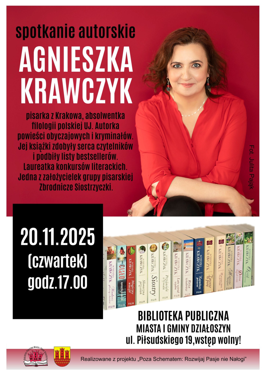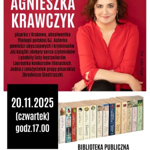 Serdecznie zapraszamy na spotkanie autorskie z Agnieszką Krawczyk - pisarką z Krakowa, absolwentką filologii polskiej UJ, autorką powieści obyczajowych i kryminałów, które odbędzie się 20 listopada o godz. 17.00 w Bibliotece Publicznej Miasta i Gminy Działoszyn.