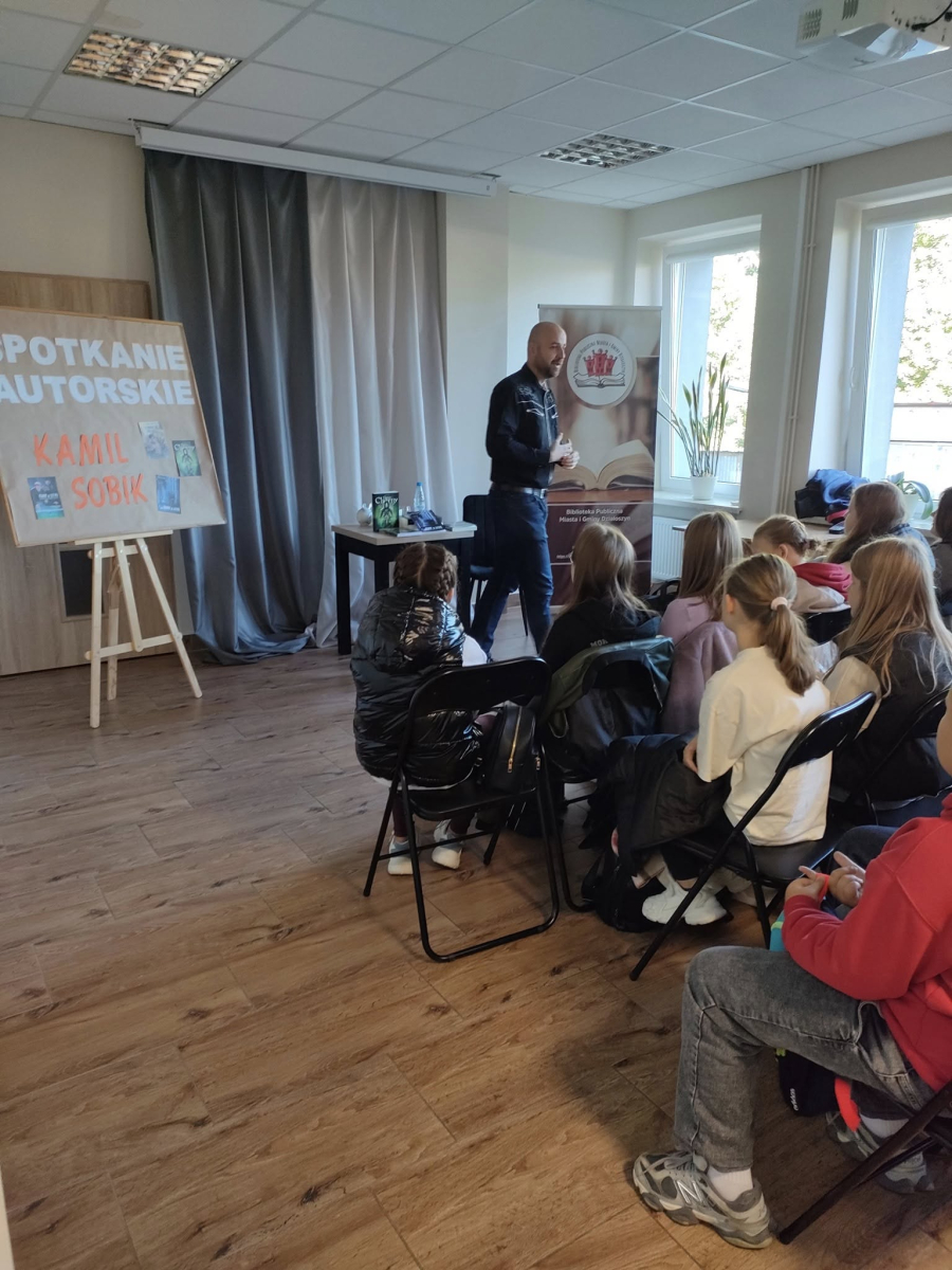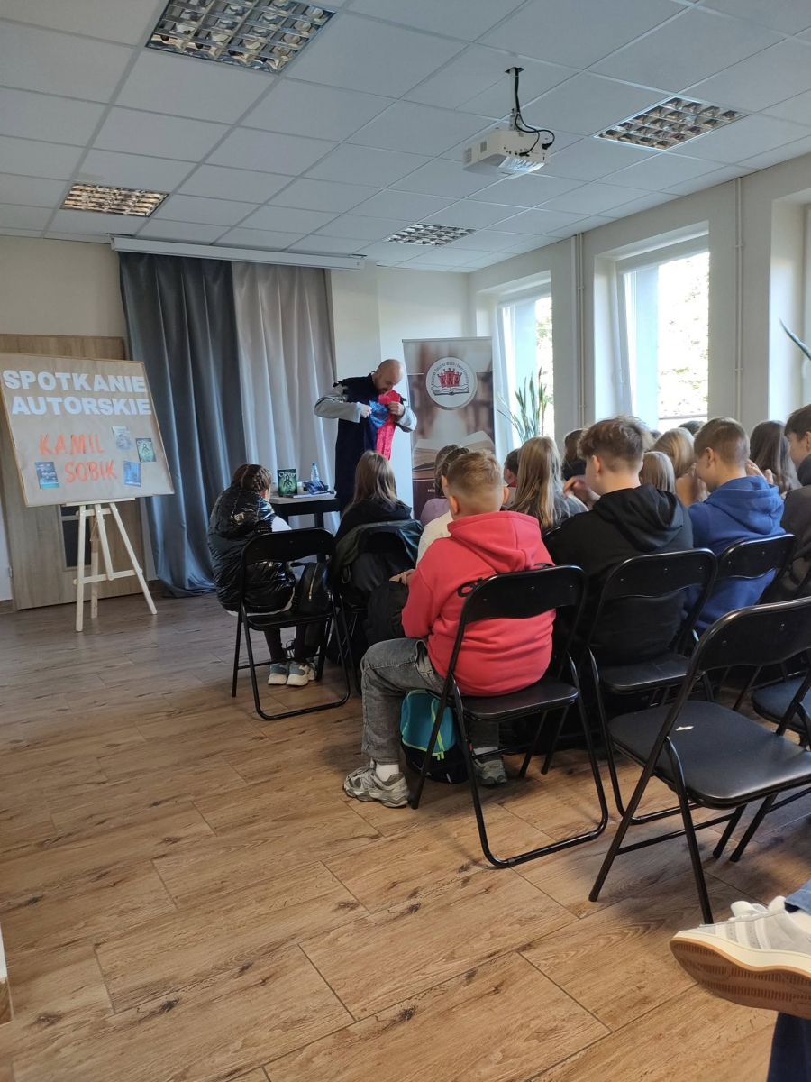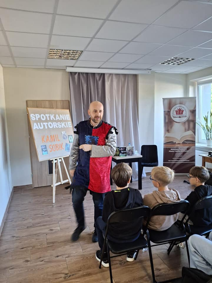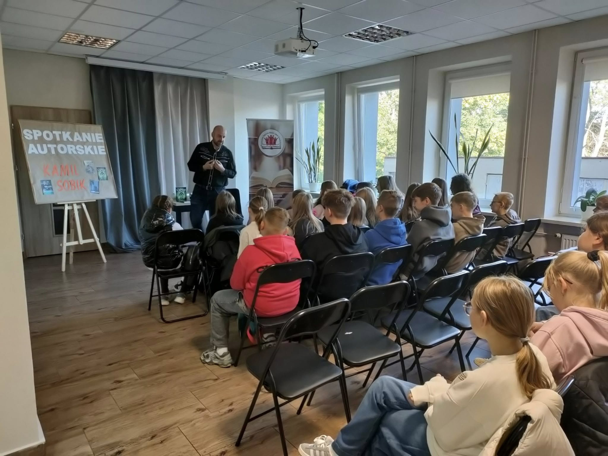 25 września 2025 r. odbyły się spotkania autorskie z Kamilem Sobikiem zorganizowane przez naszą Bibliotekę. Autor kolejno spotkał się z grupą młodzieży z Zespołu Szkolno-Przedszkolnego ze Szkołą Filialną w Kolonii Lisowice, by odpowiedzieć na ważne pytania: "Czy gry video mogą uczyć nas historii? Czyli ile faktów historycznych zawarto w grach video?" oraz grupą uczniów z Zespołu Szkolno-Przedszkolnego, Szkołą Podstawową im. ks. Jana Twardowskiego w Trębaczewie opowiadająca o tym "Skąd się wzięły smoki, elfy, czarodzieje w literaturze?"