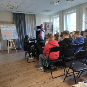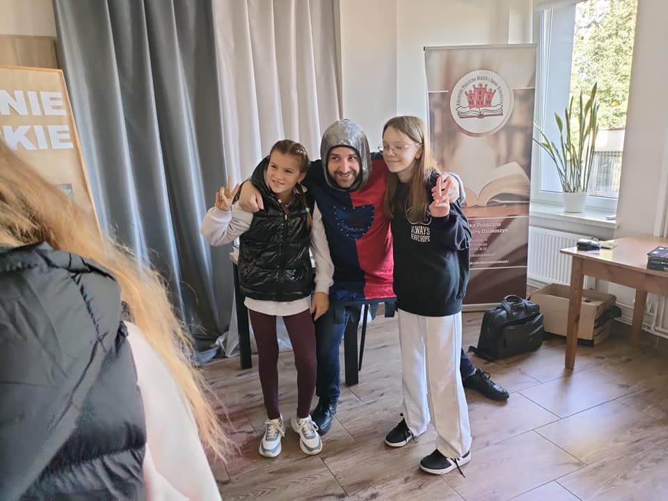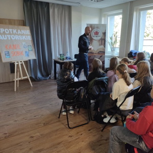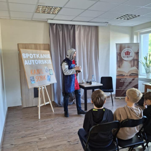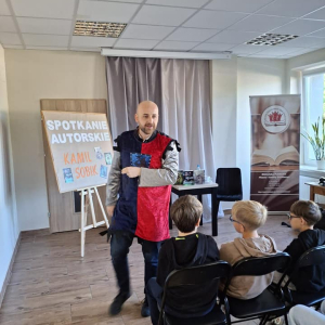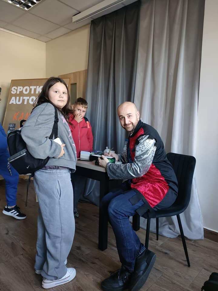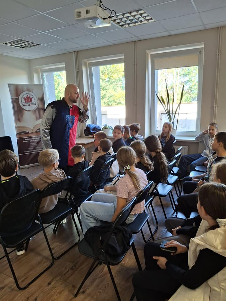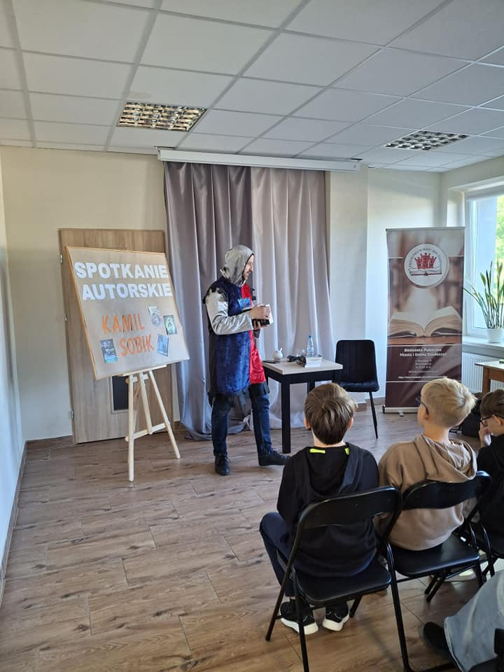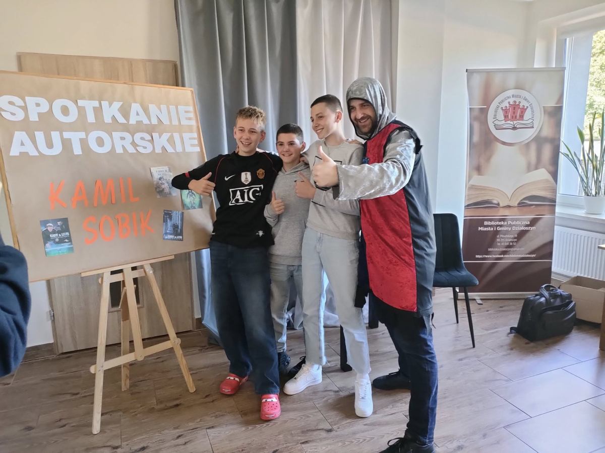 25 września 2025 r. odbyły się spotkania autorskie z Kamilem Sobikiem zorganizowane przez naszą Bibliotekę. Autor kolejno spotkał się z grupą młodzieży z Zespołu Szkolno-Przedszkolnego ze Szkołą Filialną w Kolonii Lisowice, by odpowiedzieć na ważne pytania: "Czy gry video mogą uczyć nas historii? Czyli ile faktów historycznych zawarto w grach video?" oraz grupą uczniów z Zespołu Szkolno-Przedszkolnego, Szkołą Podstawową im. ks. Jana Twardowskiego w Trębaczewie opowiadająca o tym "Skąd się wzięły smoki, elfy, czarodzieje w literaturze?"