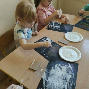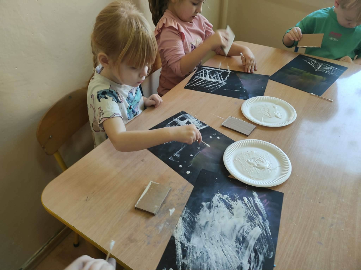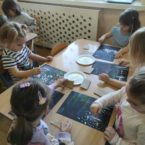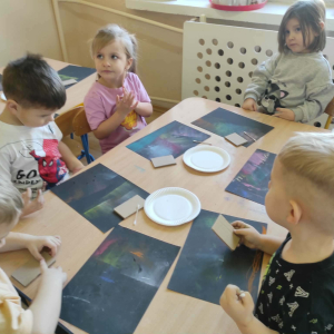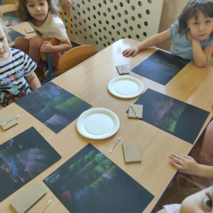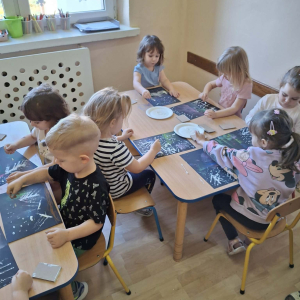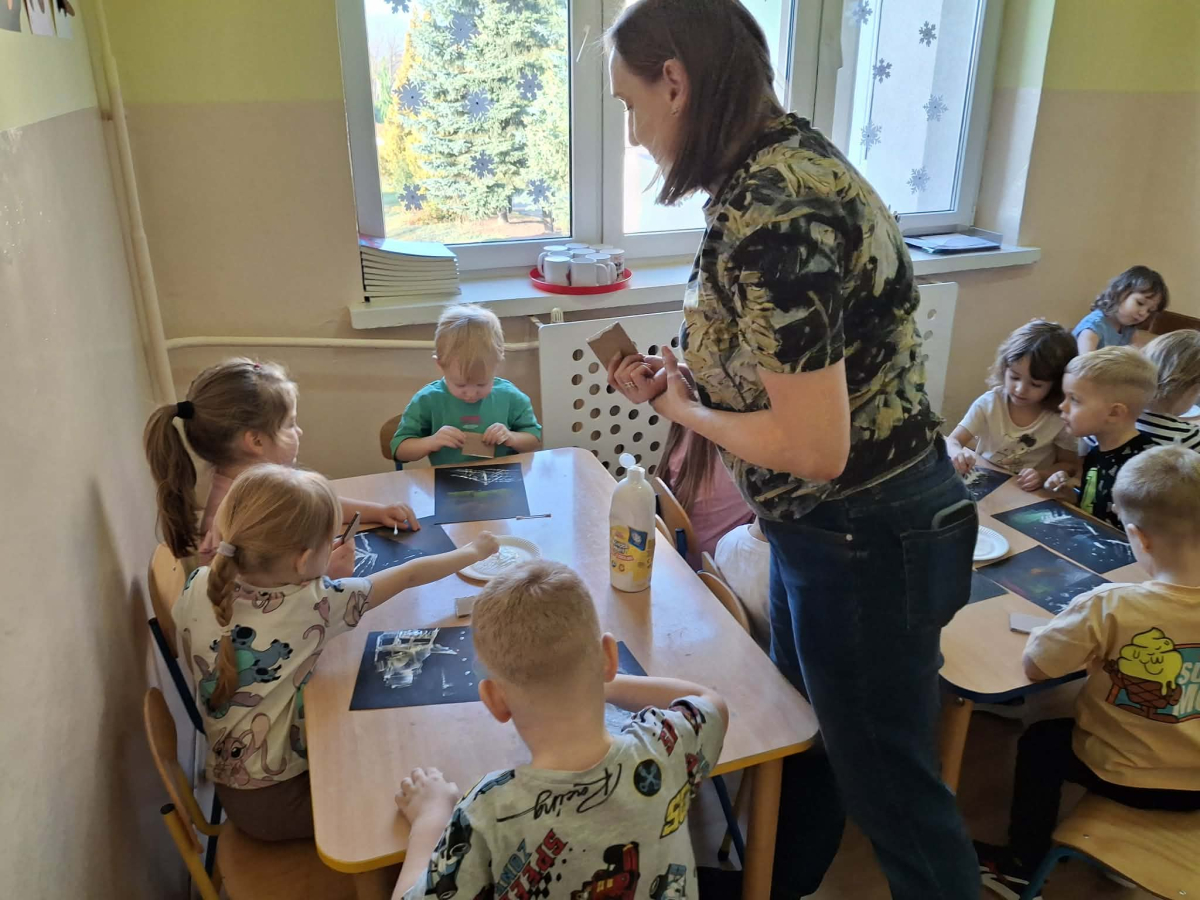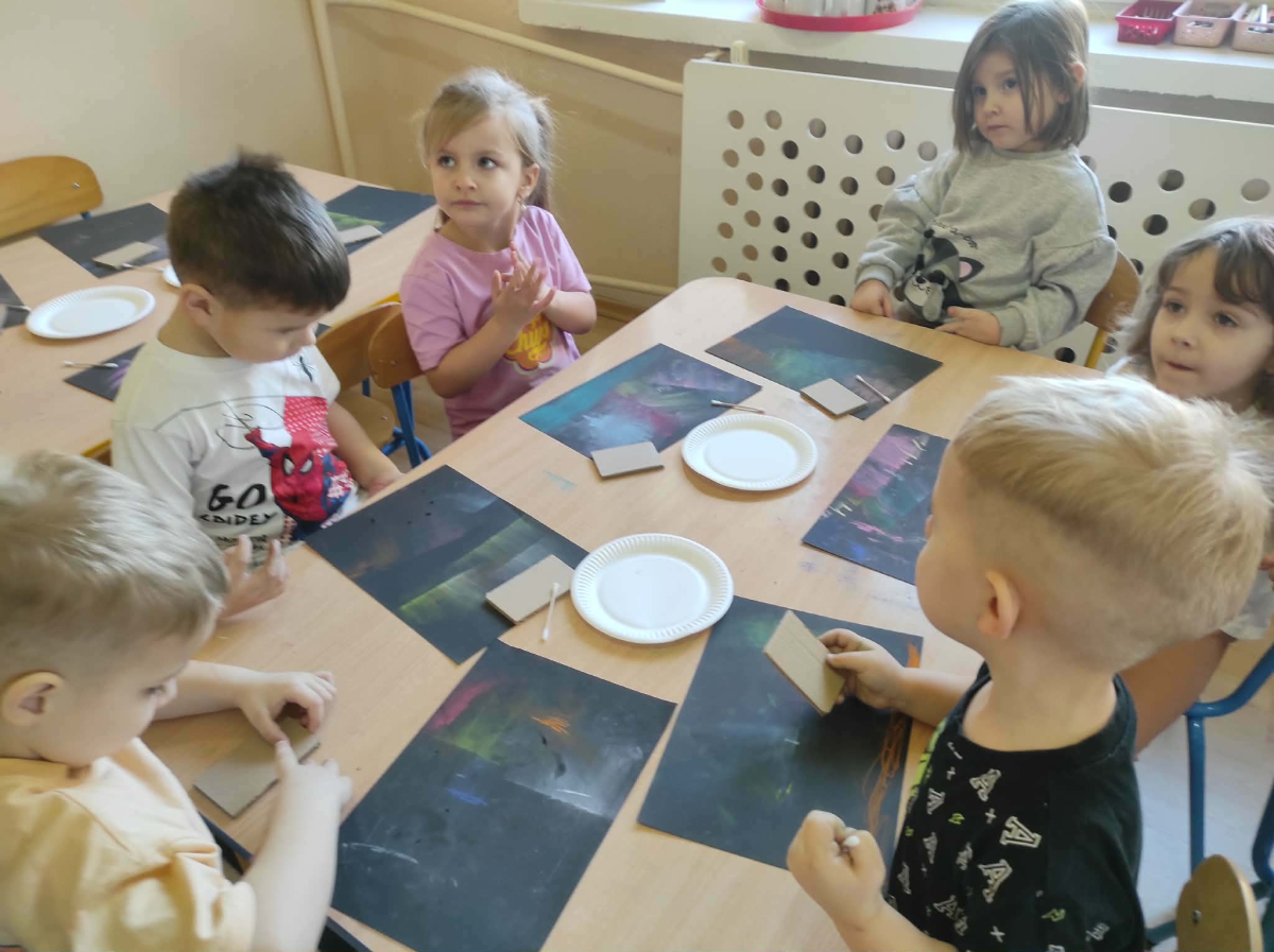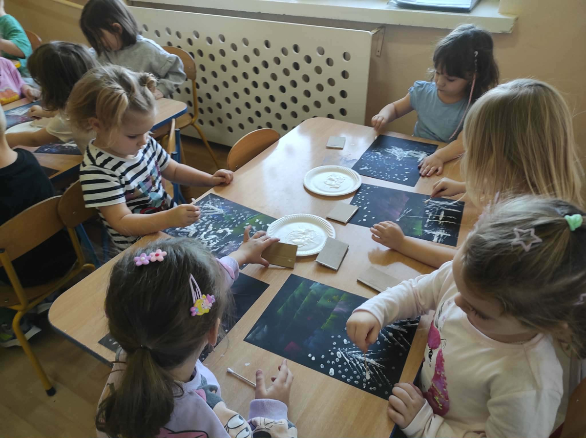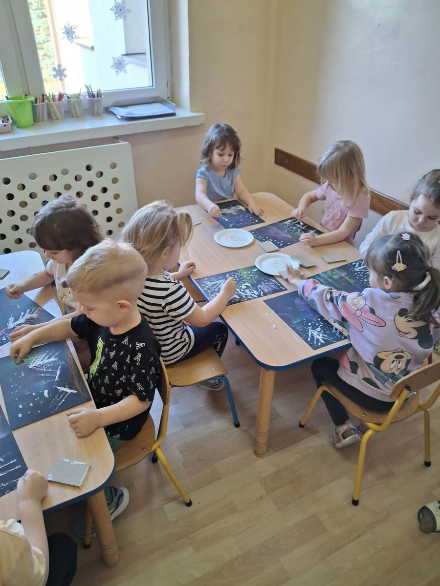 18 grudnia mieliśmy ogromną przyjemność odwiedzić grupę 4-latków z Zespołu Szkolno-Przedszkolnego w Trębaczewie. Na początku spotkania, w zamian za ich piękne, ręcznie wykonane kartki świąteczne dla seniorów przekazaliśmy im kartki przygotowane przez pensjonariuszy okolicznych DPS-ów oraz ŚDS. Podczas spotkania dzieci poznały historię Henia i Hugo z książki „Zdecydowanie nie lubię zimy”, która wprowadziła nas w świat mroźnych przygód i zimowych emocji. Następnie przedszkolaki stworzyły zachwycające zimowe pejzaże z zorzą i choinkami, korzystając z suchych pasteli oraz białej farby plakatowej. Do uzyskania wyjątkowych efektów posłużyły nam kartoniki i patyczki higieniczne.